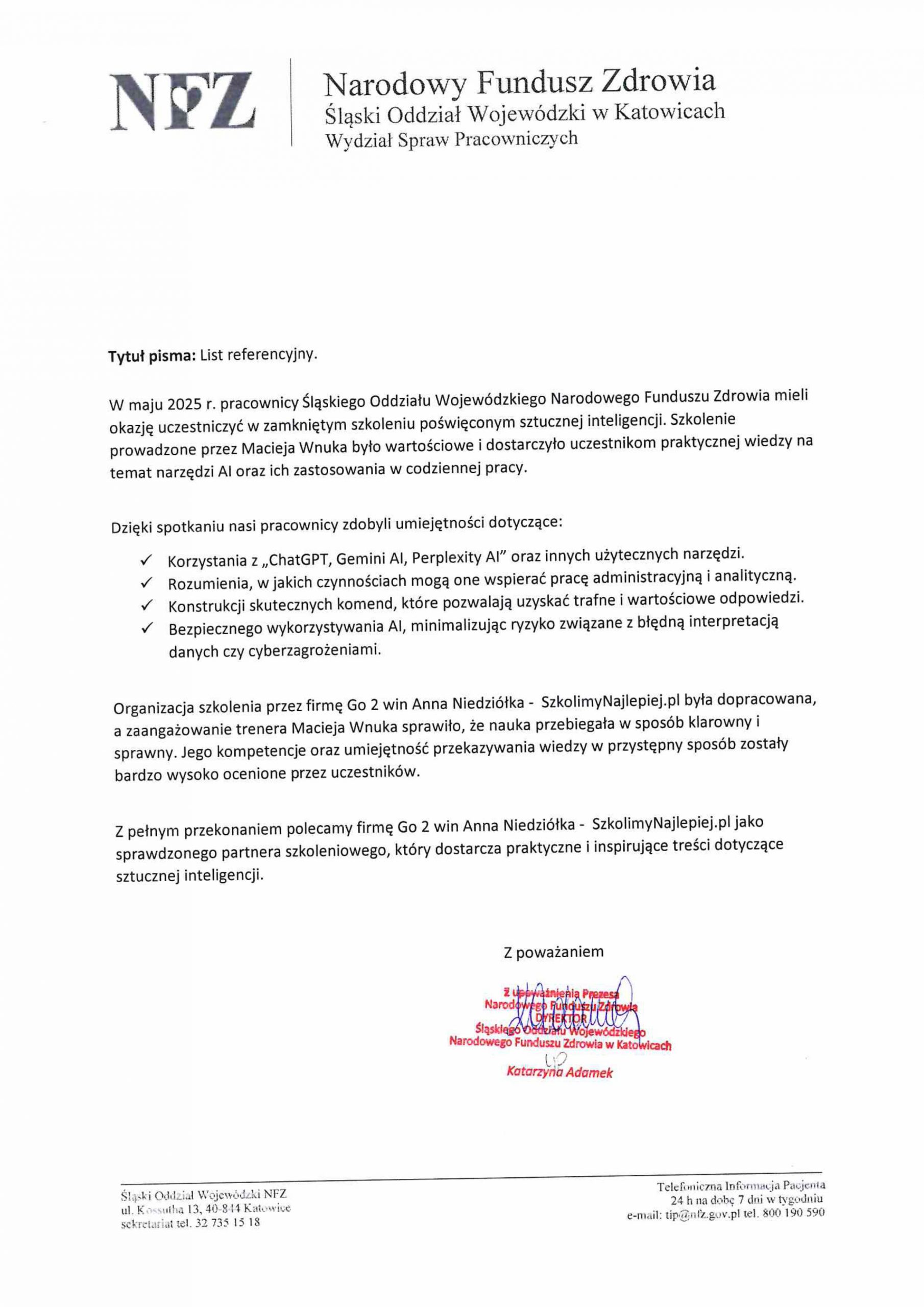 - Wszyscy uczestnicy otrzymają zaświadczenia potwierdzające ukończenie szkolenia, które będzie dowodem na zdobycie nowych kompetencji w obszarze wykorzystania sztucznej inteligencji w pracy urzędnika. (Format PDF).